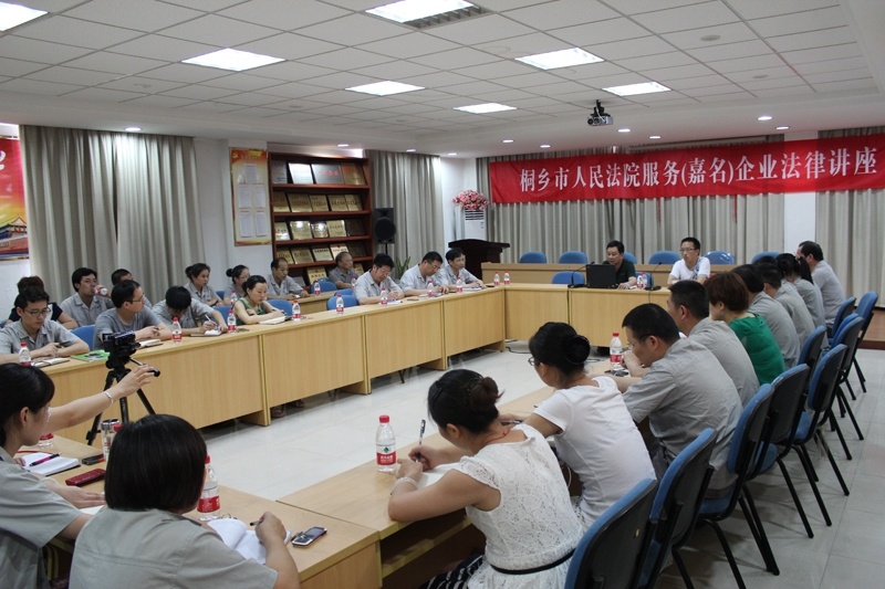 7月27日(周六)下午,應公司邀請,桐鄉市人民法院走進嘉名公司為企業提供法律服務,在公司行政樓三樓多功能廳,舉辦了一次法律專題講座。公司領導、營銷中心各部門全體人員,財務管理部、信用管理部、品質管理部、采購物控部、經編事業部的營銷、生產、財務負責人等30余人參加了會議。