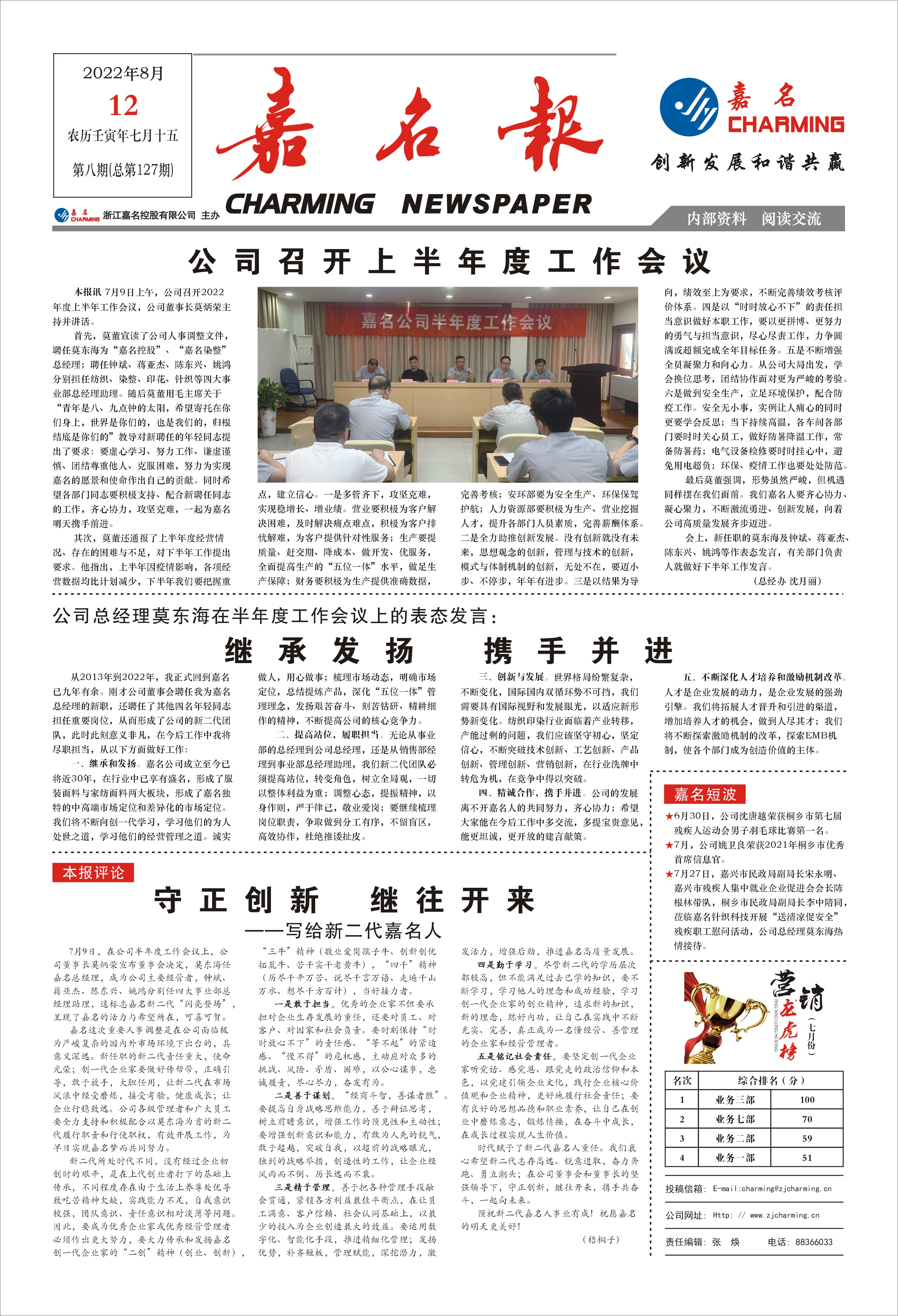 其次,莫董還通報了上半年度經(jīng)營情況、存在的困難與不足,對下半年工作提出要求。他指出,上半年因疫情影響,各項經(jīng)營數(shù)據(jù)均比計劃減少,下半年我們要把握重點,建立信心。一是多管齊下,攻堅克難,實現(xiàn)穩(wěn)增長、增業(yè)績。營業(yè)要積極為客戶解決困難,及時解決痛點難點,積極為客戶排憂解難,為客戶提供針對性服務(wù);生產(chǎn)要提質(zhì)量、趕交期、降成本、做開發(fā)、優(yōu)服務(wù),全面提高生產(chǎn)的“五位一體”水平,做足生產(chǎn)保障;財務(wù)要積極為生產(chǎn)提供準確數(shù)據(jù),完善考核;安環(huán)部要為安全生產(chǎn)、環(huán)保保駕護航;人力資源部要積極為生產(chǎn)、營業(yè)挖掘人才,提升各部門人員素質(zhì),完善薪酬體系。二是全力助推創(chuàng)新發(fā)展。沒有創(chuàng)新就沒有未來,思想觀念的創(chuàng)新,管理與技術(shù)的創(chuàng)新,模式與體制機制的創(chuàng)新,無處不在,要邁小步、不停步,年年有進步。三是以結(jié)果為導(dǎo)向,績效至上為要求,不斷完善績效考核評價體系。四是以“時時放心不下”的責任擔當意識做好本職工作,要以更拼博、更努力的勇氣與擔當意識,盡心盡責工作,力爭圓滿或超額完成全年目標任務(wù)。五是不斷增強全員凝聚力和向心力。從公司大局出發(fā),學(xué)會換位思考,團結(jié)協(xié)作面對更為嚴峻的考驗。六是做到安全生產(chǎn),立足環(huán)境保護,配合防疫工作。安全無小事,實例讓人痛心的同時更要學(xué)會反思;當下持續(xù)高溫,各車間各部門要時時關(guān)心員工,做好防暑降溫工作,常備防暑藥;電氣設(shè)備檢修要時時掛心中,避免用電超負;環(huán)保、疫情工作也要處處防范。